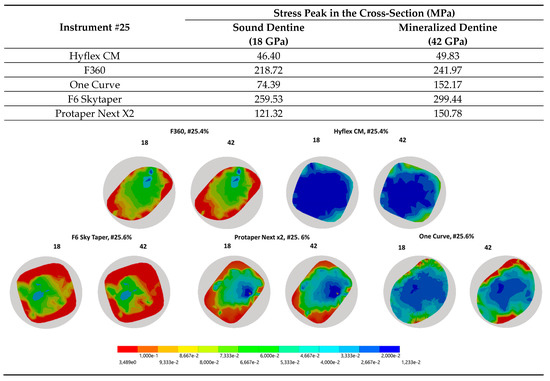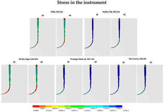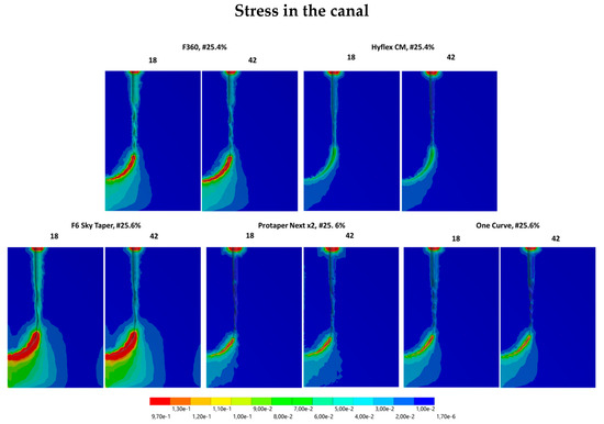 The same instrument used in canals with different dentine elastic moduli (18 or 42 GPa) provided different stress distribution patterns. Higher stress levels were evident when the instrument was in contact with the most rigid mineralized dentine canal (E = 42 GPa) (i.e., the different colors along the length of the instrument in Figure 7). The lowest stress values were achieved using the Hyflex CM #25.4% (Figure 7).