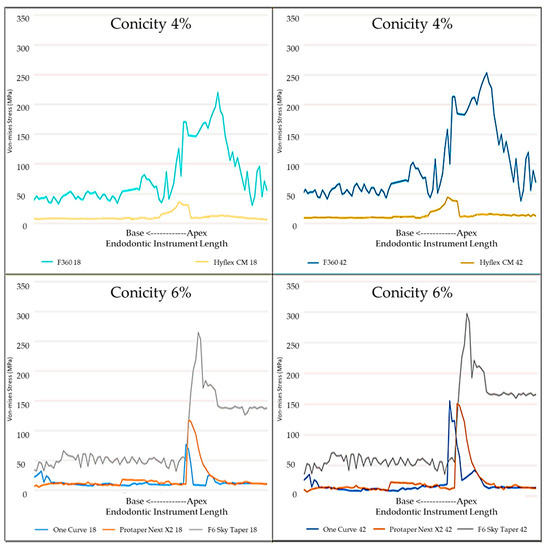 Endodontic rotary instruments are normally subjected, in a curved canal, to both compressive and tensile stresses: the concave portion of the instrument is under compression while the external portion is under tension [38]. In this study, all the heat-treated alloy instruments showed distinctly lower von Mises stress and strain values in both straight and curved regions of the different dentine root canals than the conventional ones. These data were also confirmed by the analyses on the endodontic cross sections, as reported in Figure 6, where in a section plane, the highest von Mises stress magnitudes for each instrument according to the elastic modulus of the root canal model (18 or 42 GPa) was summarized. Regarding the different instruments Hyflex CM and One Curve showed the best mechanical rotating behaviors. Recent in vitro investigations [39] confirmed, from a mechanical viewpoint, the influence of different heat treatments on the torsional and cyclic fatigue resistance of rotary instruments.