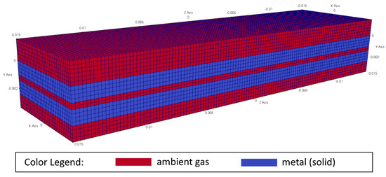 The initial (unrefined) computational grid was the same for all simulations presented within this work, except for the different gap widths. An isometric view of the entire computational domain is shown in Figure 1. The domain measured 30 mm × 8 mm × 5 mm, with the latter measurement being the height and varying slightly depending on the gap width. It was ensured that boundary conditions were not influencing the solution by performing test simulations on larger geometric domains. The initial grid shown in Figure 1 consists of 76,800 elements. The number of elements changed constantly during the course of each simulation due to the dynamic mesh refinement, reaching values of 250,000, depending on the specific simulation. Simulation S5, presented in Section 4, featured, due to the additional level of mesh refinement, approximately 50,000 additional elements. The refined mesh can be seen in Figure 2. The rise in computational times, however, mostly stems from the thus required smaller time step, as laid out in detail in Section 2.3.