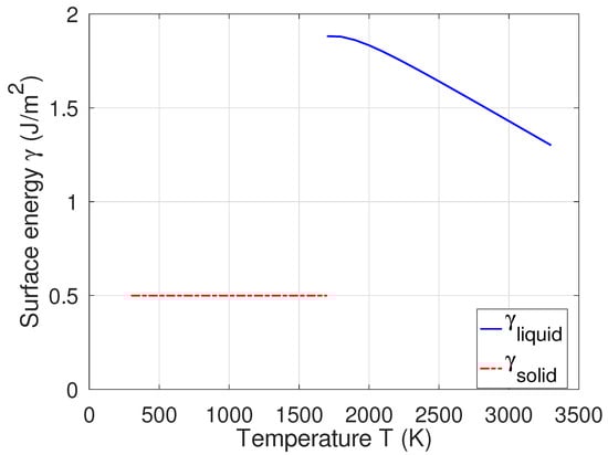 Surface energies () of the solid and liquid phases as functions of temperature (results of the calibration process).