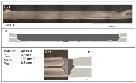 Before using the above-described model to simulate the process, some material properties, such as the complex refractive index and values for the surface energy of the material, need to be calibrated. Although some data on these properties are available in relevant literature, they are not material constants, but (at least) functions of alloy composition, impurities within the alloy, temperature and (in the case of the refractive index) laser wavelength. The dependency of surface tension on temperature is very sensitive to impurities in the form of surface-active elements, mainly oxygen and sulfur. Therefore, there are a lot of discrepancies in the available experimental measurements [26]. However, surface tension-related phenomena such as Marangoni currents are of great importance in weld pool dynamics [27], and therefore a fine-tuning of surface tension data against experimental results is necessary. In the case of the complex refractive index, this property and its temperature-dependence have a great influence on the laser-material interaction. Data are available for 304L stainless steel, e.g., in reference [28], but only one value is given for each melting and boiling temperature, respectively, with no information on temperature-dependency in between. Additionally, no information is provided as to which phases the values refer to, e.g., at the melting point, liquid or solid phase. As this property’s influence on the process is high, validation is necessary. Apart from the aforementioned material properties, discretization schemes used by the solver and the amount interface compression within the volume-of-fluid method need to be appropriately chosen in order to obtain a good fit regarding the experimental data. For this purpose, longitudinal and cross-sections of 304L stainless steel sheets welded under the presence of a gap were used. The welding experiments EX1–EX4 within this study were conducted at the facilities of AIMEN. The experimental setup consisted of an ABB IRB6600 robot carrying an Optoskand LBW tool which can provide a minimum spot diameter of 100 µm. The laser source was a Coherent fiber laser FL080 with a 100 µm diameter fiber, a wavelength of 1070 nm and a beam parameter product of 3.5 mm × mrad. No shielding gas was used. The experimental conditions are listed in Table 1.