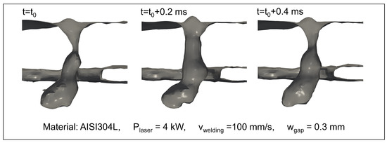 In the automotive industry, welding of overlapping galvanized steel sheets is a common task, and thus much of the research on welding of sheets with the presence of a gap was done on this topic. As the boiling temperature of Zn lies well below the melting temperature of steel, the vaporization of Zn at the interface and its venting through the melt pool or keyhole can lead to the formation of various defects, including spatter, blowholes and lack of fusion. Several sophisticated techniques to overcome these problems have been suggested, e.g., cutting a slot along the to-be welded line, generating vent holes in the bottom sheet with a pulsed laser and producing humps on the interface surface. Additionally, many-pass strategies, and slow-speed welding, have been shown to mitigate the problem, but all of these techniques are irrelevant for the automotive industry because of increased processing time and complexity. By adding a suitable gap at the sheet interface, a stable process can be achieved, yielding high-quality weld seams [18,19,20]. On the flip side, the presence of a gap can cause different defects, including underfilling, porosity, “false friends” (misconnections without outside evidence), etc. These problems are inherent to gap welding and are independent from the previously described problem of Zn-evaporation and subsequent spatter formation. The reason for the occurrence of a gap in processes with stainless steel sheets that may not be galvanized is in part thermal deformation and the thereby introduced complexity of achieving perfect contact over the whole weld bead length by designing a reliable clamping system. These scenarios were the motivation behind the study presented here, and they study by Drobniak et al. [21]. In the case of the CUSTODIAN project, the presence of a gap was not added deliberately, but was a consequence of the geometry of the parts to be welded (e.g., segments of exhaust pipes pressed together), where a zero gap is not reasonable without a massive increase in processing accuracy to reach such tight tolerances. To better understand and prevent the formation of such defects, the simulation model presented here is used to investigate keyhole laser beam welding of stainless steel sheets with a gap.