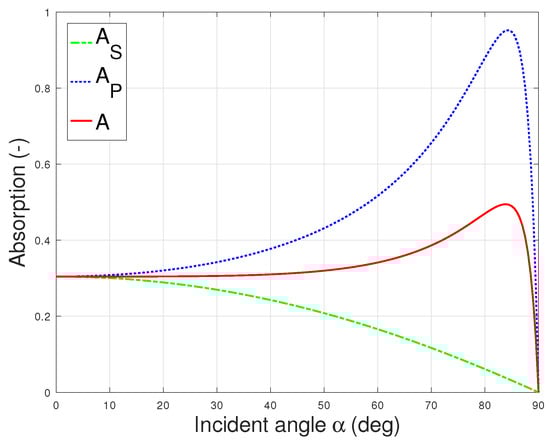 as a function of the angle of incidence, as can be seen in Figure 7. Here, the incident angle is the angle between the laser beam direction and the surface normal; therefore, corresponds to a laser beam parallel to the surface. , and A denote absorption of radiation of perpendicular, parallel and no polarization, respectively. It is obvious that a small deviation in incident angle, especially in the regime of high incident angles, as is typical for keyhole welding, has a significant effect on the fraction of laser power absorbed by the material.