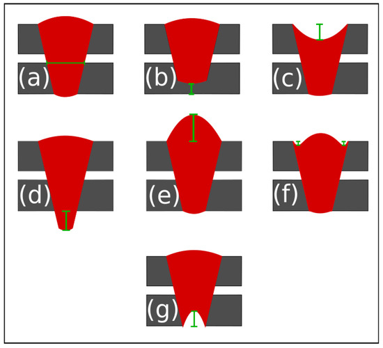 Using a sufficiently coarse mesh is a possibility for reducing computational costs and thus getting results faster, which is of paramount importance when applying any CFD model to a real-world application scenario and using it for optimizing many process parameters. To avoid unphysical results due to the coarseness of the mesh, careful calibration and validation have been performed (see Section 2.2). In the course of the CUSTODIAN project, a methodology was developed to increase the quality of a welded seam proposed by an industry partner. The quality requirements set for the welded seams are summarized in Table 2 and schematically illustrated in Figure 8.