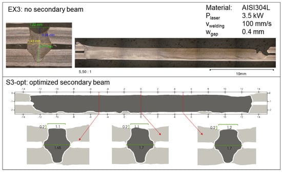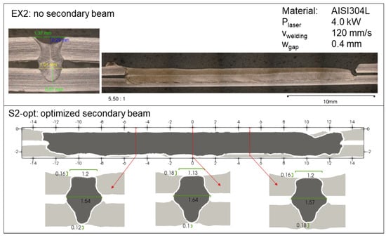 In Figure 9, the result of simulation S2-opt is shown, where an optimized secondary laser beam was added to the conditions of EX2 to reach the quality requirements listed in Table 2. Three exemplary cross-sections and the longitudinal section from the simulation are given, together with the experimental cross-section that was already partly depicted in Figure 5, now with measurements being provided to quantify the improvements through the use of a secondary beam in terms of achieving the quantitative quality requirements on the weld bead. Figure 10 and Figure 11 analogously show the results with an optimized secondary beam for different experimental conditions; all experimental parameters that are not explicitly given within the Figures can be found in Table 1.