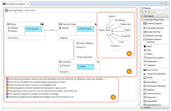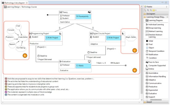 Figure 8 shows an instance of Learn-CIAT which describes the learning flow of a potential technological course. This course consists of four activities: a first theoretical activity in which the students and the professor participate in person (face-to-face); two practical activities in which the students participate in teams, such as the elaboration of a programming project and the elaboration of a digital circuit modeling project. Each of these activities can be supported by a different collaborative tool: the “Programming Project” (Figure 8b), supported by a collaborative Java editing tool; and the “Digital Circuit Project” (Figure 8c), supported by a collaborative graphical modeling tool; finally, there is an assessment activity in which the professor evaluates the work of the students.