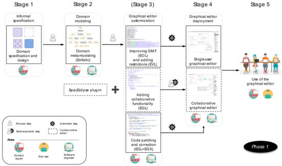 The first phase consists of a total of five stages. This process is similar to that of generating graphical editors, which uses Eugenia technology and Epsilon core languages, except for the third stage, in which it is possible to provide collaborative functionality to the generated single-user editor through its integration with SpacEclipse. The stages and the users involved are listed below.