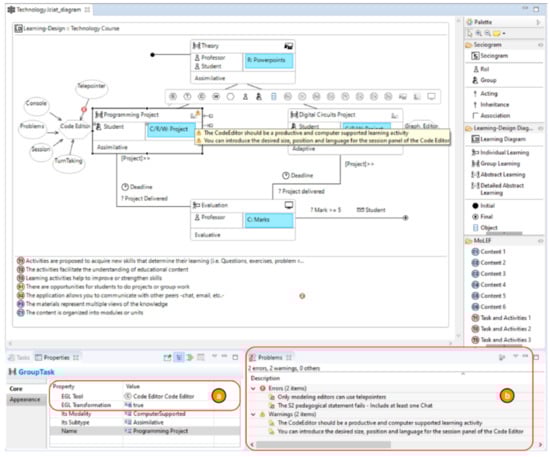 Figure 9. A validation process using the Learn-CIAT graphical editor.In Figure 9, for instance, Learn-CIAT has detected up to two errors and two recommendations after the validation process of the model: (1) an error showing that a user is trying to add telepointers to a code editor, when these can only be added to graphical modeling environments (Table 2); (2) a warning showing that the computer-supported group activity named “Programming Project” has been declared as assimilative, when these types of tasks should be of a productive nature (Table 1); and (3) lastly, different warnings showing that the professor can configure the widgets if they want (e.g., to introduce the desired position for the session panel of the code editor). In terms of pedagogical usability, since the learning flow designed does not fulfill criterion S2: “The learning systems allow the communication with other uses (chat, e-mail, forum, etc.)” (Table 3), there is one error added to the diagram. This error is displayed since the tool selected to be generated, a code editor, does not incorporate at least one chat into its workspace. Furthermore, the user can correct these errors or warnings automatically by pressing a button which will initiate the corresponding quick fix (if it was declared in the EVL template). - In stage 4, the professor can initiate the automatic collaborative tool generation process (Figure 10). To this end, we implemented a series of templates written in EGL. Specifically, seven EGL templates have been prepared. These templates are responsible for generating, in a dynamic manner, the Java classes that contain the user interface and the functionality of the final tool, with respect to the configuration of the Learn-CIAT validated model. At the same time, in order to coordinate the generation of each one of the classes, it was necessary to implement an additional EGX template, which is responsible for the generation of each Java class in the path indicated within the SpacEclipse plug-in. This way, the user only needs to focus on modeling and validating the desired system, as it will be able to generate learning tools such as the one shown in Figure 11, by simply pressing a button.