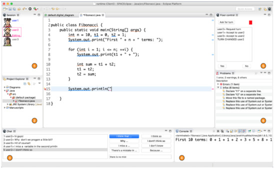 Figure 11. The collaborative Java programming tool generated.It is also important to note that, in this stage, the Software Engineer must launch the database and the server included with SpacEclipse, where the professor must access and create a new learning session. This session will be accessed later by the end users (the students) to start working collaboratively.Figure 11 shows a collaborative code editor (in Java language) surrounded by the following set of components: a session panel (1), a project explorer (2), a chat (3), a console (4), a turn-taking panel (5) and a problem view (6), each of them with their own configuration. For instance, the chat has been placed at the bottom of the editor, it is large, and it is translated into English, while the session panel is large, has been placed on the left of the editor, and has also been generated in this language. In addition, each component incorporates its own awareness characteristics. Thus, for example, the turn-taking panel includes a semaphore, located at the top right, which changes color according to the user’s request: take the turn (in green) or not take the turn (in red), and a voting system at the bottom, which indicates whether this change is accepted. - In the final stage, either the professor or the Software Engineer must export the collaborative tool generated and share it with the students. Then, the students must proceed to install it in their environments and access the corresponding collaborative learning session.