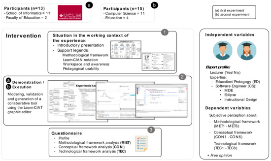 One of the main barriers in the conceptual modeling of learning scenarios rises between Education and Computer Engineering areas. The main inconvenient is that teachers or educators do not usually describe the learning scenarios in as clear and concise a manner as software engineers do, who are forced to transform ideas and projects into the precise and logical word of machines [34]. As solution to this problem, the Visual Instructional Design Languages (VIDLs), the Educational Modeling Languages (EML) and some authoring tools (those built to help users in specifying learning scenarios with some specific terminology and graphic formalism) appeared in the e-learning domain as a tool for both teachers and software and educational multimedia developers. These languages can, therefore, be seen as Domain Specific Modeling (DSM) languages for specifying formal models about instructional designs such as learning scenarios. Some approaches that the MDE paradigm applies were found in the literature: the Learning Design Language (LDL) language [35], a domain-specific language to model collaborative learning activities; the Instructional Modeling Language (IML) [36], a modeling language that is aimed to teach MDE at the university level; the Massive Open Online Courses (MOOC) Authoring Tool (MOOCAT) [37,38], based on Business Processing Modeling Notation (BPMN) (https://www.bpmn.org/, accessed on 11 March 2021), a visual authoring tool for conceiving pedagogical scenarios in a simple way through graphical representation; the CaVaDSL [39], aiming the generation of Virtual Learning Spaces for the use of the responsible of institutional archives or museums; INDIeAuthor [40], which allows authors with no programming knowledge to produce rich digital content for online publication, similar to that of the most common Learning Management Systems (LMS) such as Moodle (https://moodle.org/, accessed on 11 March 2021); or two EMLs such as PoEML [41], a process-oriented EML, and the [42] approach, an activity-oriented proposal based on Physics of Notations (PoN) [43]. Nonetheless, similar to works presented in the first lines of this section, none of them offers an adequate support to collaborative aspects such as awareness, nor to aspects related to the usability during the development of the learning tools or scenarios (neither technological nor pedagogical). As a response to this need, the next section introduces Learn-CIAM, a new methodological approach (and its specification language) that considers all these aspects (collaboration and learning issues).