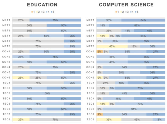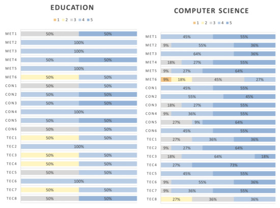 | CON6 (RQ7) | Do you think that the set of criteria selected for specifying aspects related to pedagogical usability is adequate? | 3.80 | 4.00 | 4 | - | 25% | 25% | 50% | - | - | 9% | 9% | 55% | 27% |