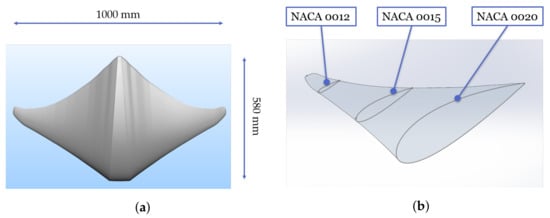 The first step of this bio-inspired robot design is reproduction of the shape of a cownose ray, in particular, of its fins. The contour of the fin is taken from the literature [9], and it is obtained by reconstructing a curve that follows the profile of a real cownose ray. The cross sections along the span of a fin can be approximated with a series of aerodynamic profiles with gradient changes from a large profile in the centre of the body to a small profile at the tip of the fin [19]. The reconstructed shape of the external surface of the robot and its dimensions are represented in Figure 2.