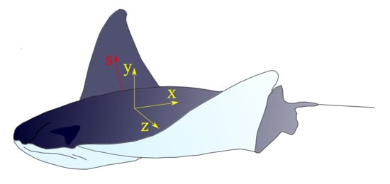 where y and z are depicted in Figure 3, is the frequency of fin flapping, is the wave number along the fin, is the angle formed by the fin at its tip, and s is the curvilinear abscissa along the fin span.