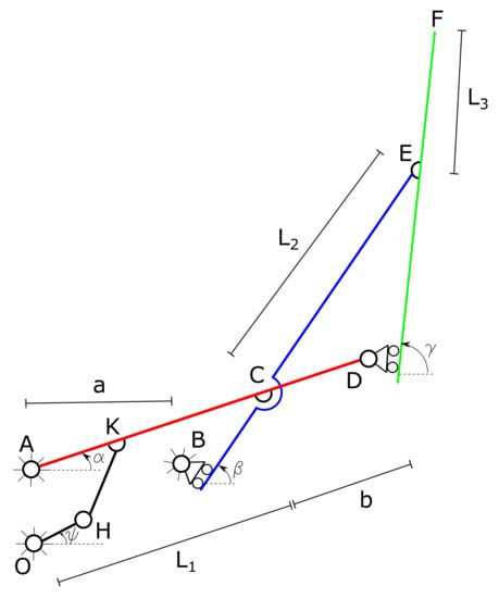 A kinematic diagram of the mechanism actuating the central part of the fin is presented in Figure 4. The four-bar linkage actuated by the motor is connected to the first link, which moves the second and third links through sliders and hinges.