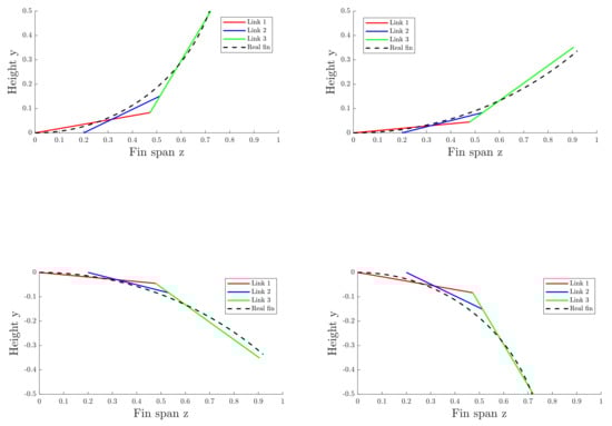 In the first stage, the four-bar linkage O-H-K is not considered in kinematic synthesis of the mechanism. The lengths of the links are selected using an optimization method to approximate as accurately as possible the deformed shape of the fin using the minimum area error method [21]. This method consists of finding the optimal combination of link lengths that minimize the area between the real deformed curve and the shape obtained with the three links. The optimization procedure is performed considering an adimensional problem and considering the overall length of the fin span in the central section.