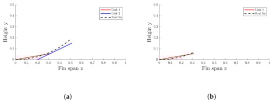 The other two mechanisms moving the fin are designed with the same optimization method. Since the deformation of the fin in every section is described by the same equations as that in the central section, the only difference between real deformation of the front or back sections and the central section is in the length of the fin span. Given that the result obtained with optimization of the mechanism of the central part of the fin is more than satisfactory, the same kinematic diagram is used for the mechanisms on the front and back of the fin. To account for different lengths of fin span, the mechanism for the frontal part of the fin (Figure 6a) lacks the third link; similarly, the link in the back of the fin (Figure 6b) lacks both the second and the third links, as shown in Figure 6. Since both the curve defining deformation of the fin and the kinematic diagram are the same, the optimization gives the same results and the link lengths are equal to those on the central mechanism of the fin.