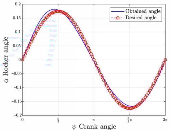 To transform the continuous rotation of the motor into an alternative rotation of the first link, a four-bar linkage was designed. Considering Figure 4, the angle is written as a function of the angle and of the lengths of the links composing the four-bar linkage, and the error function is then minimized. The result of the optimization is shown in Figure 7, where the angle obtained with the four-bar linkage and the desired angle of Equation (5) are plotted.