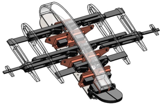 Many robots that take inspiration from a batoid fish use a single actuator to move each fin, and undulatory motion is obtained with the passive flexibility of the fin itself. One such robot is the Manta ray robot developed by Gao et al. [5], which features a large central body and rigid leading edges with support for the flexible fin membrane. The Robo-Ray II is composed of a flexible rubber exterior shell containing a rigid central part and pneumatic artificial muscles actuating the fins [6,7]. Robo-Ray III, made by Niu et al. [8,9], is characterized by a central body equipped with control flaps for stability and a flexible membrane of silicone rubber. The robot ray developed by Chew et al. [10] features a rigid central body containing two servomotors that actuate the bionic fins, which are thin foils with a rigid leading edge.