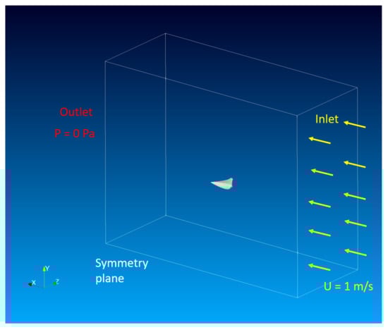 The numerical simulation was 3D and unsteady, and it was performed using a moving mesh. Unsteady-Reynolds-Average-Navier-Stokes (URANS)equations were solved, and the method was used to model turbulence. is a well-established turbulence model since it combines the best features of and methods: a formulation was adopted in the inner parts of the boundary layers and a formulation was adopted in the free stream [22]. Considering the symmetry of the fish, only one fin was present in the simulation, and symmetry plane boundary conditions were imposed on the middle plane of the body for every variable. In Figure 10, it is possible to see the domain of the simulation with the imposed boundary conditions.