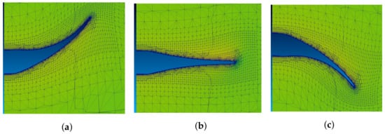 The mesh was composed of 1,005,416 cells, with 7 levels of refinement around the surface of the fin. The mesh motion on the fin surface was imposed with a custom function that moves the points of the mesh according to Equations (1) and (2). The rest of the mesh was deformed using a Laplacian motion solver with a quadratic inverse distance diffusivity. In Figure 11, the deformed mesh is shown at different positions of the fin motion.