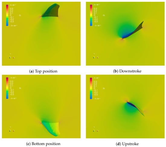 In this analysis, the fin moved with a frequency of 1 , 0.4 waves were present on the fin, and one period, i.e., 1 , was simulated. The pressure distribution on the fin at different instants of fin motion is shown in Figure 12. As it is possible to observe, the motion created a negative pressure in front of the fin and a positive pressure behind it, so that the fish was pushed forward by the surrounding fluid.