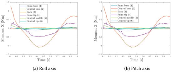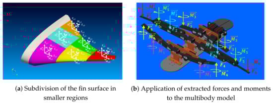 To analyze the effect of such a pressure distribution on the torque and on the power required by the motors, the surface of the fin was divided in six smaller regions and, in each of them, the resultant force and moment vectors were extracted, as shown in Figure 13. These forces and moments were then exported to Simulink and applied in the correspondent positions of the robot.