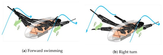 The control algorithm acting on all six motors can be summarized in a matrix form, shown in Equation (11) for forward swimming and in Equation (12) for a left turn. (In both equations, the integral contribution is omitted to simplify the notation.)