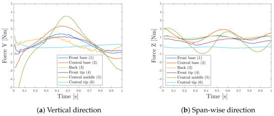 The forces and moments acting on each region of the fin are presented in Figure 15 and Figure 16, where the number of regions correspond to the numbers indicated in Figure 13. The presented forces and moments refer to the right fin, the one present in the simulation; on the left fin, the vertical force and the pitch moment are equal, whereas the force on the span-wise axis and the roll moment have an opposite sign.