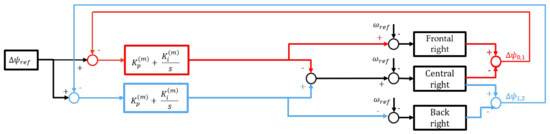 where is the reference velocity given by the input, is the desired phase shift between the mechanisms, and is the measured angular position of the motor. The numeration of motors is the same as in Figure 19. The gains and control the phase shift between mechanisms of the same fin, and the gains and control the synchronization between the two fins.