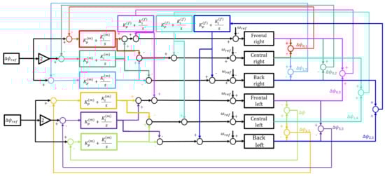 The block diagram of the complete control algorithm for forward swimming is shown in Figure 19. Since the mechanisms are mounted in a mirrored configuration, the motors of different fins rotate in opposite directions. Therefore, the phase shift between the same mechanisms for the same fins is calculated as the sum of the two angles instead of their difference.