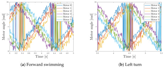 The results of the control algorithm can be better appreciated by looking at Figure 22, where the signals coming from the encoders are plotted. In Figure 22a, the encoder measurements are taken when the fish swims forward and it is possible to note that, for both fins, the front mechanisms (Motor 0 and Motor 3) are in advance with respect to the central mechanisms (Motor 1 and Motor 4), and the back mechanisms (Motor 2 and Motor 5) are in delay. On the other side, in Figure 22b, the measurements come from a left turn maneuvre; for the right fin, the mechanisms have the same phase shift as for forward swimming, whereas for the left fin, the back mechanism (Motor 5) is in advance with respect to the central mechanism (Motor 4) and the front mechanism (Motor 3) is in delay.