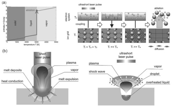 Two major processes responsible for absorption in metals and dielectrics involve the intra-band and inter-band transitions [43,44,54,55]. The first include the electrons excitation and heating in metals whereas the second is important for absorption in dielectrics. And involves single/multi-photon absorption and avalanche acceleration of electrons in valence band to the energy exceeding band gap. Dielectric subsequently can considered to be in the metal-like state [43]. Usually a few seed electrons are present in the valence band. Although the direct photon absorption is typically small, they gain energy by accelerations and collisions in laser field. Once they gain energy in excess of the band gap, can further collide with the electrons in the valence gap to transfer them for excitation into conduction band. Thus, the mechanism involves an avalanche of ionisation events. The other important ionization process that contributes into the total ionization rate is multi-photon ionization. This process is readily enhanced while fs-laser radiation is applied. Probability of simultaneous absorption of several photons (multi-photon absorption) is increasingly higher in case of femtosecond radiation than in case of ns-laser radiation [42,43,55,56]. Through multiphoton absorption induced by fs-lasers, a sufficiently large amount of energy can be deposited to cause ablation, even in materials that are transparent to the applied laser wavelength [56]. Typically, the light used needs to be of some sufficiently high enough energy (depending on the optical properties of the material) to be absorbed by the ablated material. Then the power density needs to be high enough to ionise all ablated material. For most materials ablated with ~100 fs laser pulses, laser intensity in the range from 1012 to 1013 W/cm2 is applied [43]. At these conditions multiphoton absorption becomes important. The ionisation time duration (separation of electrons from the atoms) is becoming also shorter than the laser pulse duration. Ionization of the sample material already occurs early in the time-span of the radiation interaction (tens offs) [57] and can create a high-density plasma within the nm-thin surface. The primary process of electron excitation by the ultra-short laser pulse occurs in complete non-equilibrium conditions.