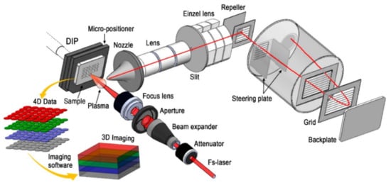 fs-LIMS is built with two components, namely an fs-laser ablation ion source and a mass analyser. In the present discussion, we take only TOFMS into account since it is an obvious choice for pulsed lasers. The fs-laser radiation source consists of an fs-laser system and an optical system shaping and focusing laser pulses on a sample. The ions produced in the ablation process are analysed either instantaneously by TOFMS or after additional pretreatment [21,24]. In one of the high fluence LIMS systems, the ions are first thermalised by passing them through a gas collision cell. After that cell, an additional ion optical lens system is used to transport the ions to the ion extraction region where they are introduced into the mass analyser via the orthogonal extraction method [22,23]. Frequently, ion-optical systems of current TOFMS used for fs-LIMS undergo careful ion-optical modelling to optimise their ion transmission and mass resolution. This is an important procedure in obtaining high-performance miniature TOMS [21] and advanced TOFMS [24] capable of supporting the high mass resolution.