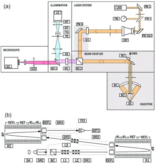 Schematic of optical and ion-optical system of LMS-GT; (a) The layout of the optical system applied in LMS-GT combines optics for laser ablation ion source, microscope system and the surface illumination system for the microscope observations. The Schwarzschild objective, supporting tight focusing conditions, is placed near the sample surface; (b) Ion optical design of LMS GT: SA: Sample location, SRC: ion source, DR1–DR4: Drift Tubes, L1–L3: Lens 1–3, DEFL: Deflection plates, R1&R2: Reflectrons, RL: Reflectron Lens RET: Retarder Section REF: Reflector Section BP: Backplane, DR: Drift Tubes, DET: Detector (for more details see reference [24]). Reprinted with permission from [24].