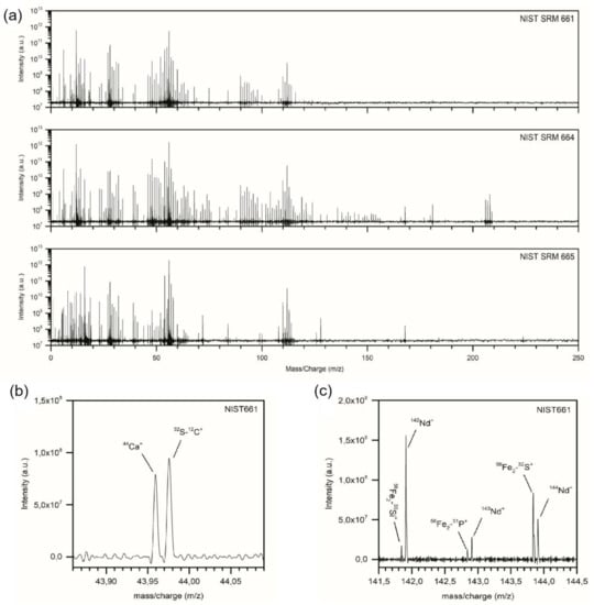 (a) Typical spectrum recorded with LMS-GT for three NIST SRM steel samples. The applied mass range is compatible with the applied data acquisition card to optimally use the sampling range of the card; (b) At the mass m/z = 44 both isotopic 44Ca and diatomic 32S-12C mass peaks can be measured; (c) At the mass peaks 142, 143 and 144 in addition to isotopic Nd also diatomic mass peaks are observed [141].