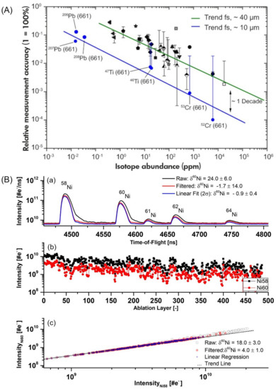 In our group, the data analysis protocol was developed specifically for the LIMS application supporting the automatic analysis of a large amount of data [151], typically in the context of 2D and 3D chemical imaging. The developed software allows fast and precise quantitative data analysis of time-of-flight mass spectrometric data. The quantitative analysis of isotopes, using automatic data analysis, yields results with an accuracy of isotope ratios up to 100 ppm for a signal-to-noise ratio (SNR) of 104. The accuracy of isotope ratios was found to be inversely proportional to both SNR and mass resolution (m/Δm). Follow-up studies by our group identified that the individual spectral degradation can significantly affect the mass resolution and quantification while accumulating the spectra for improvement of the signal-to-noise ratio (SNR) in LIMS [112]. These are spectra not only suffering from accidental surface and space charging, but also detector saturation. Spectral degradation of the overall spectrum can occur if some individual mass spectra, affected by peak broadening, are included in the accumulation process. The studies present the method to automatically identify individual spectra subjected to peak broadening and a filtering method capable of systematic and reproducible exclusion of such spectra from the accumulation process. Improvements in the isotope accuracy of Si, Ni, and Cr by factors between 1.6 and 7.7 were demonstrated [112]. In very recent studies, the data analysis protocols based on the isotope intensity correlation and depth profiling data were developed in the same group. High-quality depth profiling data allowed a high-degree correlation between the isotope signals. The isotope ratio (δ-notation) can be derived from linear regression with accuracy and precision at the per mille level [152]. The data used for precise isotope measurements are improved using a spectrum cleaning procedure that ensures the removal of low-quality spectra. Furthermore, correlation of isotopes of an element is used to identify and reject the data points that, for example, do not belong to the species of interest or are affected by detection effects, such as detection saturation, spectral distortion or insufficient S/N. The isotope intensity correlation method was successfully applied in LA-ICP-MS earlier, yielding an improved isotope accuracy and precision compared to more traditional methods [1,153].