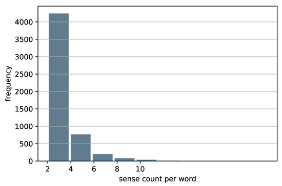 Arabic gloss WSD suffers from the lack of context-gloss pair datasets [16]. Arabic Word Net (AWN), which is the only available gloss dataset, contains only word senses with gloss definitions but lacks context examples for these senses [27]. Due to this limitation in AWN, we created a new Arabic WSD benchmark. This dataset is extracted from the “Modern Standard Arabic Dictionary” [28]. To the best of our knowledge, our benchmark is the only available Arabic context-gloss pair dataset. It consists of 15,549 senses for 5347 unique words with an average of 3 senses for each word. Figure 1 shows the histogram of sense counts per word. We can see that most of the words (4000+) have 2 to 4 senses, that about 750 word are between 4–6 senses per word, and that the count decreases as the number of senses increases. Each record in the dataset is a tuple of three elements: a word sense, a context example, and a definition of that word sense. In Table 1, we present the statistics of the dataset. This dataset is available online (https://github.com/MElrazzaz/Arabic-word-sense-disambiguation-bench-mark.git, accessed on 10 March 2021). Table 2 shows examples of records in the benchmark’s dataset. We believe that the benchmark can contribute to standardizing the evaluation of WSD models.