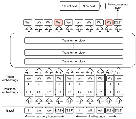 BERT [7] is a language model that is based on the architecture of the transformers reviewed above. As can be seen in Figure 3, BERT’s architecture consists of a stacked set of transformer encoders. A key aspect of BERT is that it is designed to be trained in an unsupervised manner with no particular task at hand. To facilitate training, two objectives were proposed to optimize BERT. (1) Given a sentence with a particular word, it is masked (replaced with a placeholder) and then such a word is predicted. (2) Given two sentences, say X and Y, the order of such sentences is predicted; that is, whether Y appears before X or vice versa is predicted. The model that learned in this manner is shown in [11] to encode phrase-level information in the lower layers, while in the middle layers, it encodes surface, syntactic, and semantic features. Moreover, the top layers of the model encode long-distance dependencies in the sentence.