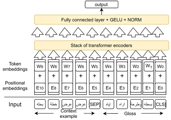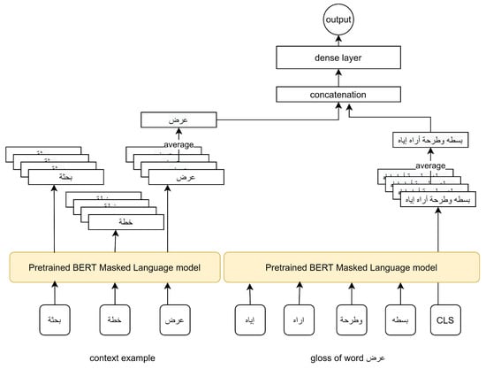 The second type of knowledge base approaches is gloss-based approaches. These methods measure the semantic similarity or the overlap between the context of the target word and the dictionary definition of that word (gloss of the word). The authors in [21] used the Lesk algorithm to measure the relatedness of the target word’s context to its definition. They used AWN as a source for the word gloss. The authors of [22] combined unsupervised and knowledge-based approaches. They used a string matching algorithm to match the root of salient words that appear in many contexts of a particular sense with the gloss definition. The authors of [23] employed word2vec [15] to generate a vector representation for the target word’s context sentence and the gloss sentence. Then, cosine similarity was used to match the gloss vector and the context vector. The authors in [24] used Rough Set Theory and semantic short text similarity to measure the semantic relatedness between the target word’s context and multiple possible concepts (gloss). Recently, The authors in [25] used FLAIR [26], a character-level language model, to generate sentence representation vectors for both context and gloss sentences. The sentence’s vector was calculated by taking the mean of its word vectors, causing a loss of information, especially when the sequence is long. Cosine similarity was then used to measure the similarity between the word context sentence and the gloss sentence.