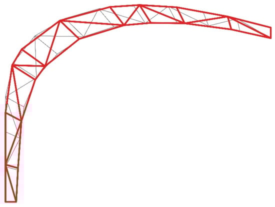 In the beginning, a first version of the truss, as shown in Figure 2, was conceptualised based on the authors’ engineering know-how. The predefined floor area, the existing roof of the hall as well as the working area of the robot served as boundary conditions. The mentioned first truss design was used as a reference model for all the results of the optimisation. It consisted of 12 segments, alternating diagonal struts and regular spacing between the subdivisions.