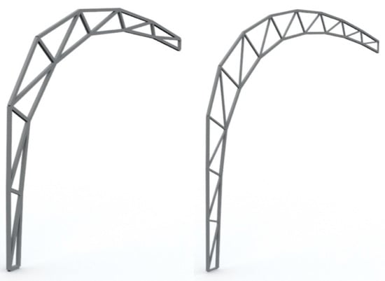 Different kinds of optimisation results: truss with 7 subdivisions and cross section of the truss members of 80 × 80 mm2 and final design for the housing of the robot laboratory (left); theoretical result of the optimisation by also considering the cross section as a parameter, leading to a truss with 11 subdivisions and a cross section of 60 × 60 mm2 of the outer members as well 40 × 40 mm2 for the internal members (right).