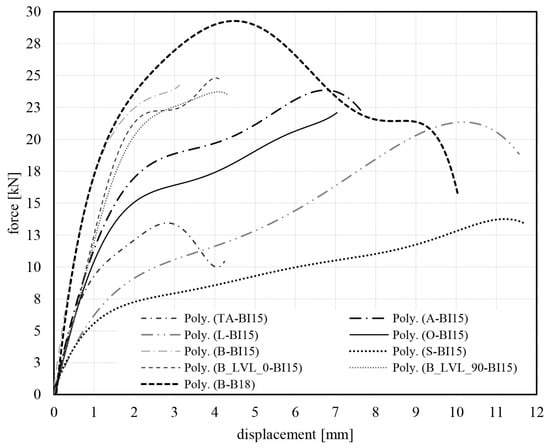 Comparison of the influence of the wood species of pegs on the load-bearing capacity and stiffness of the tensile joint of test series I (xx-BI15) and the ultimately chosen combination from series II (B-B18). Results are shown as regressive lines of the mean values of three specimens each. Coefficient of determination R2 > 0.992 (xx-BII5) and R2 = 0.949 (B-B18).