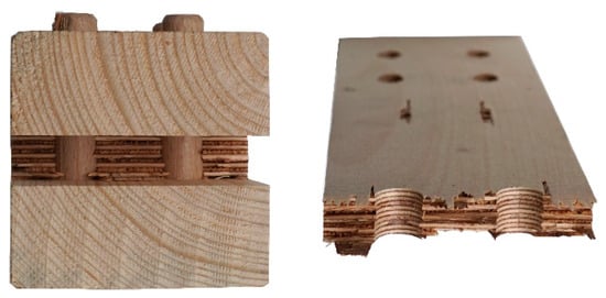 Wood is a natural inhomogeneous anisotropic material with discontinuities due to defects as, for example, pitch pockets, branches and fibre twist. When used for building construction, the original material undergoes multistage sorting and processing [1,2,3]. These processes, and if applied gluing, allow for a compensation of the defects, resulting in smoother and consequently better material properties [4,5]. In addition, subsequent geometry changes due to an adjustment of the equilibrium moisture can be reduced [6]. The drawback regarding these products is that the production process is accompanied by many subtractive machining operations. The yield rate sinks to 25–35% within the processing of the tree trunk into the finished building component. Consequently, good mechanical properties and advantageous behaviour regarding geometric deformations are the opposite of a low yield of the raw material.
