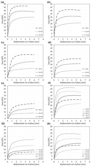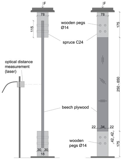 As the truss nodes are stressed in different directions, three orientations of the main load-bearing direction of the plywood panel were tested. The joints consisted of 18 mm beech plywood panels inserted into the truss members and fixed with four wooden pegs (beech) with a 14 mm diameter. The joint configuration was chosen according to the B-B18 configuration of the tensile tests, presented in Section 3.2. The aim was to transfer the compression loads not only through the peg/plywood joint but also through the contact surface between the beech plywood panel and the spruce truss member. The free length in this test series was set to 250 mm and increased in 100 mm steps up to 650 mm. Each step of the free length was tested at an angle of 0°, 45° and 90° of the plywood’s main load-bearing direction to the direction of force. The investigated configurations are summarised in Table 3. Three specimens per configuration were tested again. The test results are shown in Figure 11. The diagrams (a)–(e) show the comparison of the influence of the orientation of the top layer of the plywood according to the load direction for the different free lengths. The diagrams (f)–(h) show the influence of the free length for different orientations of the top layer of the plywood.
