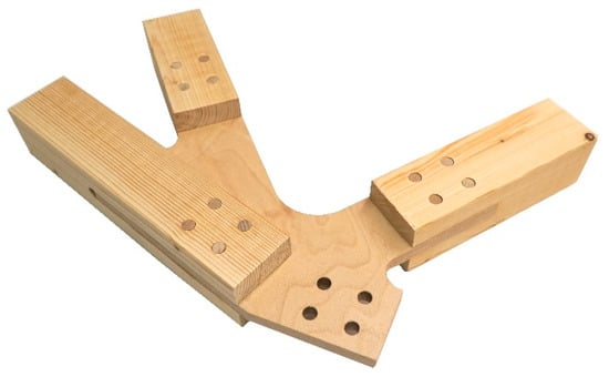 For the above-mentioned curved optimised truss, spruce (C24) with a cross section of 80 × 80 mm2 was chosen for all truss members, making this the first boundary condition for the joint design. Due to manufacturing tolerances, however, the cross sections of all provided specimens turned out to be 78 × 78 mm2. The node elements (plates) were made from plywood panels and were inserted into the truss members and fixed with wooden pegs. According to [29], the spacing of the pegs in the direction of force was chosen with three times the peg diameter (3d). As the cutting depth for notching the truss member for the plywood panel was limited, due to the manufacturing process, to 115 mm, the diameter of the pegs was set to 14 mm. The combination of all geometric boundary conditions resulted in a total of four pegs per connection.