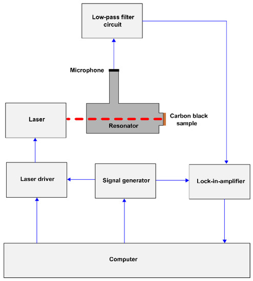 The experimental setup is illustrated in Figure 1. A distributed feedback quantum cascade laser (DFB-QCL) (Nanoplus, Nanosystems and Technologies GmbH, Gerbrunn, Germany) is selected as the source of radiation. The laser is operated using a driver (Q-MACS SC, neoplas control GmbH, Greifswald, Germany) that integrates a control system for laser current, voltage and temperature. The laser temperature is maintained at 16 °C and emits pulses of 100 ns width at a wavenumber of 1080 cm−1 to excite a carbon black sample. Carbon black is selected to ensure a constant and homogeneous absorbance over the surface and a dry atmosphere inside the resonator. The PA signal is detected using a digital micro-electro-mechanical system (MEMS) microphone (Knowles SPH0641LU4H-1). The microphone has a resonance at around 25 kHz and has a fairly flat response between 35 kHz and 65 kHz. The frequency response plot of the microphone can be found in our previous work [21]. The microphone output represents a digital pulse density modulated (PDM) signal which is send through a low-pass filter circuit for demodulation. The demodulated signal is fed into the lock-in-amplifier (DSP Lock-in Amplifier model 7265, Signal Recovery, United State of America) which exhibits a time constant of 100 ms.