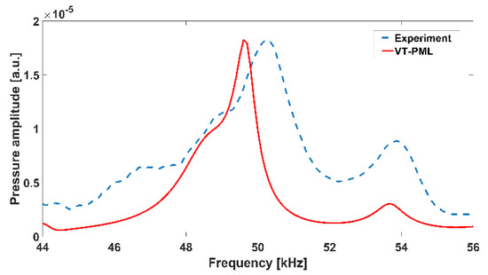The results of the PA measurement and of the VT-PML simulation for the reference resonator are shown in Figure 3. The experimental result has been smoothed using the Savitsky–Golay Matlab function [24]