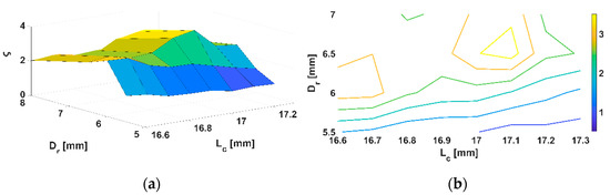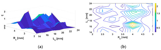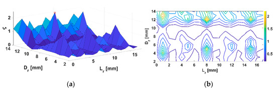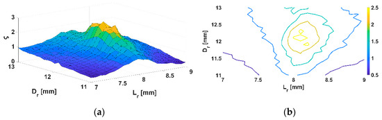 The highest value of 2.2 is observed when is 12 mm and is 8 mm (highlighted in Figure 4). Since our interest is to get the largest signal, a finer sweep of between 11 mm and 13 mm and between 7 mm and 13 mm, both with 0.1 mm step size, is performed. The results of the finer sweep are presented in Figure 6. The highest value from the finer sweep is 2.5 when is 8.1 mm and is 12.3 mm.