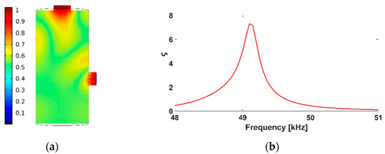 (a): Absolute pressure distribution inside the optimized resonator at 49.2 kHz. (b): Relative PA signal of the optimized resonator around 49.2 kHz.