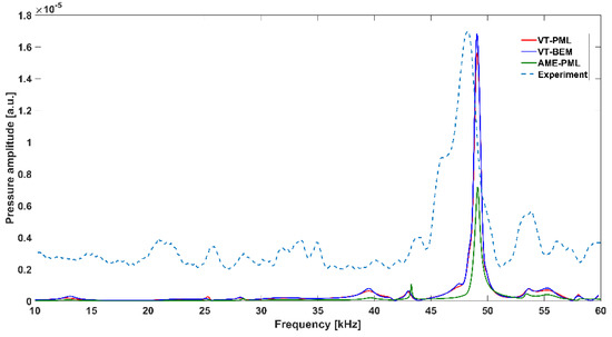 Additionally, the frequency response of the optimized resonator is calculated using the VT-PML, VT-BEM and AME-PML approaches. The AME-PML simulation is performed with frequency intervals of 10 Hz. The VT-PML and VT-BEM simulations are performed at intervals of 300 Hz and fitted with a cubic spline. The difference in the increments is because the simulation time of the AME-PML is shorter than that of the VT-PML and VT-BEM approach [21]. In order to account for the production limits, the resonator dimensions are rounded 0.01 mm. The three simulation plots are shown in Figure 11 together with the experimental results.